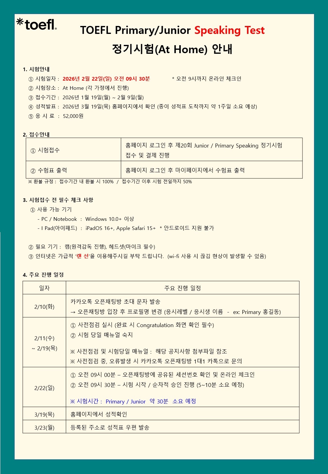 TOEFL Primary/Junior Speaking 정기시험(20회-At Home) 관련하여 안내 드립니다.