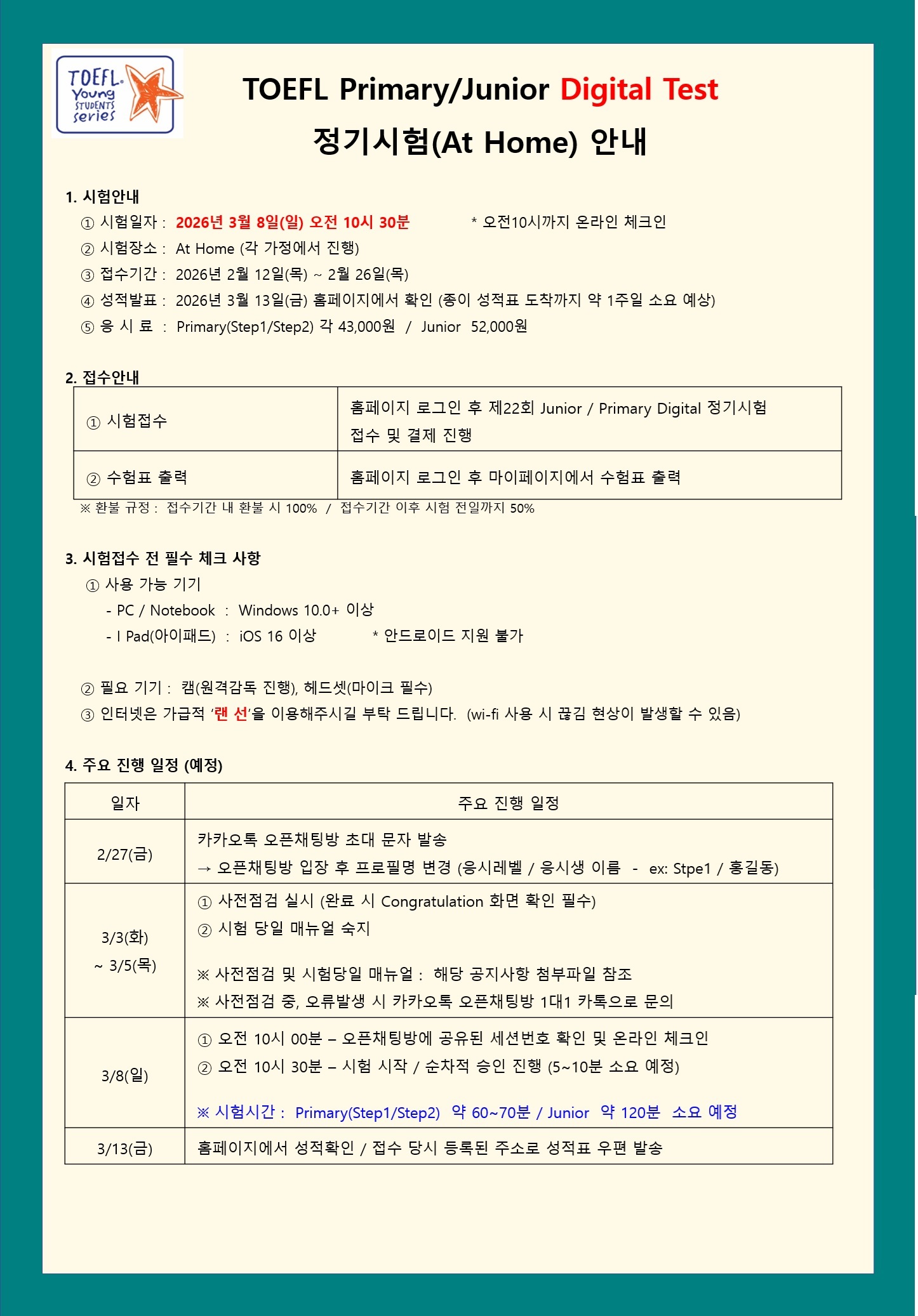 TOEFL Primary/Junior Digital 정기시험(2ㅈ회-At Home) 관련하여 안내 드립니다.